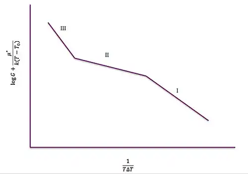 The Lauritzen–Hoffman plot (right) models the three different regimes when (logG) + U*/k(T-T0) is plotted against (TΔT)−1.[3] It can be used to describe the rate at which secondary nucleation competes with lateral addition at the growth front among the different temperatures. This theory can be used to help understand the preferences of nucleation and growth based on the polymer's properties including its standard melting temperature.