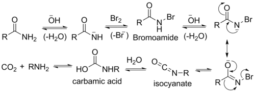 The reaction of bromine with sodium hydroxide forms sodium hypobromite in situ, which transforms the primary amide into an intermediate isocyanate. The formation of an intermediate nitrene is not possible because it implies also the formation of a hydroxamic acid as a byproduct, which has never been observed. The intermediate isocyanate is hydrolyzed to a primary amine, giving off carbon dioxide.[2]