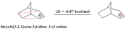 In addition to the homotropylium cation, another well established cationic homoaromatic compound is the norbornen-7-yl cation, which has been shown to be strongly homoaromatic, proven both theoretically and experimentally.[15]