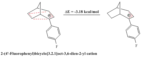Similarly, a substituted bicyclo[3.2.1]octa-3,6-dien-2-yl cation (the 2-(4'-Fluorophenyl) bicyclo[3.2.1]oct-3,6-dien-2-yl cation) was also shown to be an antiaromate when compared to its corresponding allyl cation, corroborated by theoretical calculations as well as by NMR analysis.[30]