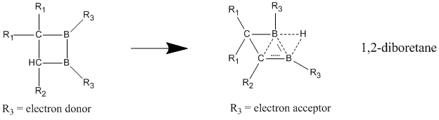Of the neutral homoaromatics, the compounds best believed to exhibit neutral homoaromaticity are boron containing compounds of 1,2-diboretane and its derivatives. Substituted diboretanes are shown to have a much greater stabilization in the delocalized state over the localized one, giving strong indications of homoaromaticity.[25] When electron-donating groups are attached to the two boron atoms, the compound favors a classical model with localized bonds. Homoaromatic character is best seen when electron-withdrawing groups are bonded to the boron atoms, causing the compound to adopt a nonclassical, delocalized structure.