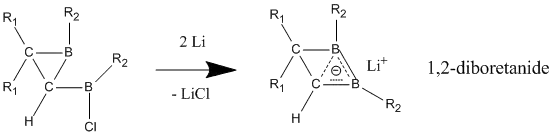 Unlike neutral homoaromatic compounds, anionic homoaromatics are widely accepted to exhibit "true" homoaromaticity. These anionic compounds are often prepared from their neutral parent compounds through lithium metal reduction. 1,2-diboretanide derivatives show strong homoaromatic character through their three-atom (boron, boron, carbon), two-electron bond, which contains shorter C-B bonds than in the neutral classical analogue.[27] These 1,2-diboretanides can be expanded to larger ring sizes with different substituents and all contain some degree of homoaromaticity.
