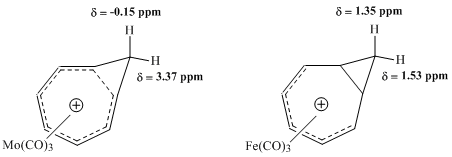 Subsequent NMR studies undertaken by Winstein and others sought to evaluate the properties of metal carbonyl complexes with the homotropylium ion. Comparison between a molybdenum-complex and an iron-complex proved particularly fruitful. Molybdenum tricarbonyl was expected to coordinate to the homotropylium cation by accepting 6 π electrons, thereby preserving the homoaromatic features of the complex. By contrast, iron tricarbonyl was expected to coordinate to the cation by accepting only 4 π electrons from the homotropylium ion, creating a complex in which the electrons of the cation are localized. Studies of these complexes by 1H NMR spectroscopy showed a large difference in chemical shift values for methylene protons of the Mo-complex, consistent with a homoaromatic structure, but detected virtually no comparable difference in resonance for the same protons in the Fe-complex.[9]