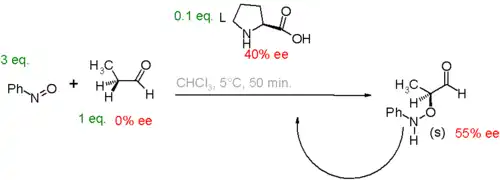 Another study[27] concerns the proline catalyzed aminoxylation of propionaldehyde by nitrosobenzene. In this system, a small enantiomeric excess of catalyst leads to a large enantiomeric excess of product.