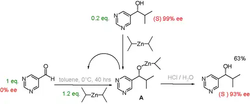 - ↑ Takanori Shibata; Hiroshi Morioka; Tadakatsu Hayase; Kaori Choji; Kenso Soai (1996). "Highly Enantioselective Catalytic Asymmetric Automultiplication of Chiral Pyrimidyl Alcohol". J. Am. Chem. Soc. 118 (2): 471–472. Bibcode:1996JAChS.118..471S. doi:10.1021/ja953066g.