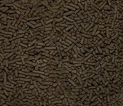 A variety of compositions are known, such as "hopcalite II" that is approximately 60% manganese dioxide and 40% copper oxide (the MnO2 : CuO molar ratio is 1.375)[2] and "hopcalite I" that is a mixture of 50% MnO, 30% CuO, 15% Co2O3, and 5% Ag2O.[2][3] Hopcalite has the properties of a porous mass and resembles activated carbon in its appearance.[1]