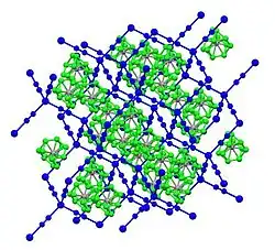 Yet another related class of compounds are clathrates, which often consisting of a lattice that traps or contains molecules.[11] The word clathrate is derived from the Latin clathratus (clatratus), meaning 'with bars, latticed'.[12]