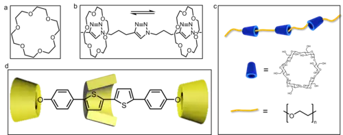 Cyclodextrin (CD) are tubular molecules composed of several glucose units connected by ether bonds. The three kinds of CDs, α-CD (6 units), β-CD (7 units), and γ-CD (8 units) differ in their cavity sizes: 5, 6, and 8 Å, respectively. α-CD can thread onto one PEG chain, while γ-CD can thread onto 2 PEG chains. β-CD can bind with thiophene-based molecule.[5] Cyclodextrins are well established hosts for the formation of inclusion compounds. Illustrative is the case of ferrocene which is inserted into the cyclodextrin at 100 °C under hydrothermal conditions.[22]