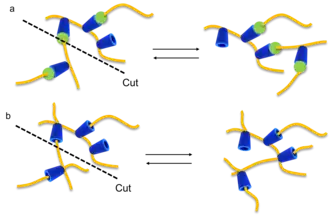 A self-healing hydrogel constructed from modified cyclodextrin and adamantane .[31][33] Another strategy is to use the interaction between the polymer backbone and host molecule (host molecule threading onto the polymer). If the threading process is fast enough, self-healing can also be achieved.[32]