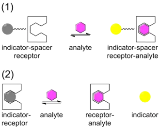 Traditionally, chemical sensing has been approached with a system that contains a covalently bound indicator to a receptor though a linker. Once the analyte binds, the indicator changes color or fluoresces. This technique is called the indicator-spacer-receptor approach (ISR).[43] In contrast to ISR, indicator-displacement assay (IDA) utilizes a non-covalent interaction between a receptor (the host), indicator, and an analyte (the guest). Similar to ISR, IDA also utilizes colorimetric (C-IDA) and fluorescence (F-IDA) indicators. In an IDA assay, a receptor is incubated with the indicator. When the analyte is added to the mixture, the indicator is released to the environment. Once the indicator is released it either changes color (C-IDA) or fluoresces (F-IDA).[44]