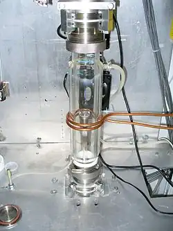 During the growth process of magnesium diboride thin films by HPCVD, the carrier gas is purified hydrogen gas H2 at a pressure of about 100 Torr. This H2 environment prevents oxidation during the deposition. Bulk pure Mg pieces are placed next to the substrate on the top of the susceptor. When the susceptor is heated to about 650 °C, pure Mg pieces are also heated, which generates a high Mg vapor pressure in the vicinity of the substrate. Diborane (B2H6) is used as the boron source. MgB2 films starts to grow when the boron precursor gas B2H6 is introduced into the reactor chamber. The growth rate of the MgB2 film is controlled by the flow rate of B2H6/H2 mixture. The film growth stops when the boron precursor gas is switched off.