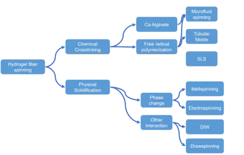 To produce hydrogel fiber, the solidification of the pregel solution is the most important step. The pregel solution needs to be solidified while maintaining its fibrous shape. To achieve this, several methods based on chemical crosslinking, phase change, rheological property change have been developed.