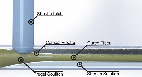 One of the most commonly used fiber production methods is the crosslinking of sodium alginate by CaCl2, where the formed calcium alginate will act as the crosslinking point to link the alginate chains together to form the network and solidified the polymer. Afterward, this alginate hydrogel fiber can be used as a template for the polymerization of secondary networks. Additionally, by controlling the fluid dynamics inside the microfluid device, the diameter and the shape of the resulting fiber can be tuned without doing modification to the devices.[1]