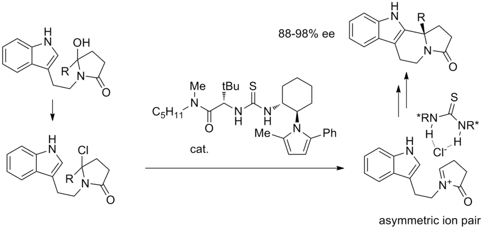 One of the first reactions proposed to proceed through anion-binding catalysis is the Pictet-Spengler-type cyclization of hydroxy lactams with TMSCl under thiourea catalysis.[12] In the proposed mechanism, after initial substitution of the hydroxyl group with chloride, the key ion pair is formed. The activated iminium ion is closely associated with the chiral thiourea-bound chloride, and intramolecular cyclization proceeds with high stereoselectivity.