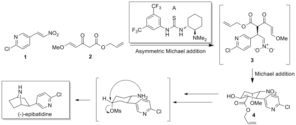 In 2008, Takemoto disclosed a concise synthesis of (−)-epibatidine that relied on a Michael cascade, catalyzed by a bifunctional catalyst.[31] After initial asymmetric Michael addition to the β-nitrostyrene, intramolecular Michael addition furnishes the cyclic ketoester product in 75% ee. Standard functional group manipulations and an intramolecular cyclization yields the natural product.