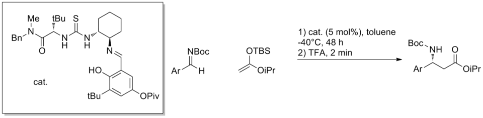 - ↑ Wenzel, A. G.; Jacobsen, E. N. (2002). "Asymmetric catalytic Mannich reactions catalyzed by urea derivatives: enantioselective synthesis of β-aryl-β-amino acids". J. Am. Chem. Soc. 124 (44): 12964–12965. Bibcode:2002JAChS.12412964W. doi:10.1021/ja028353g. PMID 12405820.