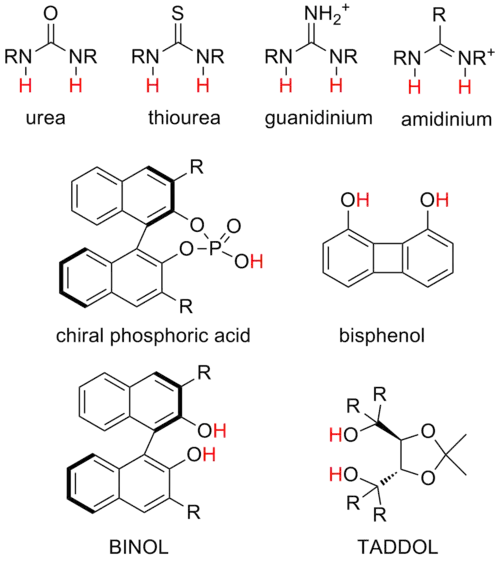 The types of hydrogen-bond donors used in catalysis vary widely from reaction to reaction, even among similar catalytic strategies. While specific systems are often studied and optimized extensively, a general understanding of the optimal donor for a reaction or the relationship between catalyst structure and reactivity is greatly lacking. It is not yet practical to rationally design structures to promote a desired reaction with the desired selectivity. However, contemporary hydrogen-bond catalysis is primarily focused on a few types of systems that experimentally seem to be effective in a variety of situations.[21] These are termed "privileged structures". However, it is worth noting that other structural scaffolds and motifs have also shown promising results, such as metal-coordinated hydrogen-bond donors.[22]