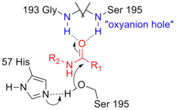 This mode of catalysis is found in the active sites of many enzymes, such as the serine proteases.[4] In this example, the amide carbonyl is coordinated to two N–H donors. These sites of multiple coordination designed to promote carbonyl reactions in biology are termed "oxyanion holes". Delivery of serine nucleophile forms a tetrahedral intermediate, which is stabilized by the increase hydrogen bonding to the oxyanion hole.
