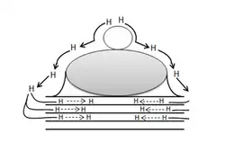 In heterogeneous catalysis, hydrogen molecules can be adsorbed and dissociated by the metal catalyst. Hydrogen spillover is the migration of hydrogen atoms from the metal catalyst onto the nonmetal support or adsorbate.[1][2] Spillover, generally, is the transport of a species adsorbed or formed on a surface onto another surface.[3] Hydrogen spillover can be characterized by three major steps, the first being where molecular hydrogen is split via dissociative chemisorption into its constitutive atoms on a transition metal catalyst surface, followed by migration from the catalyst to the substrate, culminating in their diffusion throughout the substrate surfaces and/or in the bulk materials.[4]