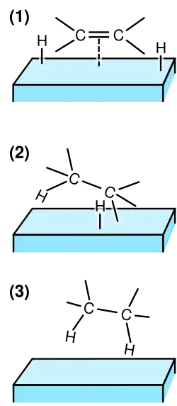 On solids, the accepted mechanism is the Horiuti-Polanyi mechanism:[21][22]