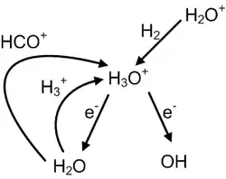 Interstellar hydronium is formed by a chain of reactions started by the ionization of H2 into H+2 by cosmic radiation.[33] H3O+ can produce either OH− or H2O through dissociative recombination reactions, which occur very quickly even at the low (≥10 K) temperatures of dense clouds.[34] This leads to hydronium playing a very important role in interstellar ion-neutral chemistry.