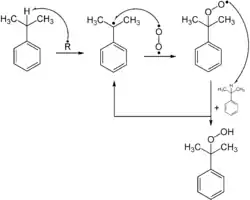Compounds with allylic and benzylic C−H bonds are especially susceptible to oxygenation.[10] Such reactivity is exploited industrially on a large scale for the production of phenol by the Cumene process or Hock process for its cumene and cumene hydroperoxide intermediates.[11] Such reactions rely on radical initiators that reacts with oxygen to form an intermediate that abstracts a hydrogen atom from a weak C-H bond. The resulting radical binds O2, to give hydroperoxyl (ROO•), which then continues the cycle of H-atom abstraction.[12]