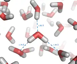 Dynamic hydrogen bonds between molecules of liquid water, the shape of the molecules is sometimes compared to that of boomerangs.