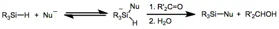In the presence of fluoride ions, hydrosilanes reversibly form hypervalent fluorosilicates with the formula R3Si(F)H−). These species are reducing agents, akin to borohydride.[3][4]