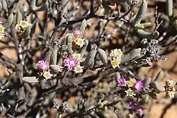 Ruschia sp. (Aizoaceae) flowers and multi-stage seed capsules - Some plants synchronize the opening of their mature seed capsule with active rainfall- hygrochasy. This dispersal technique is frequently observed in the arid regions of southern and eastern Africa, the Israeli desert, parts of North America and Somalia, and believed evolved to offer higher survival rates in arid environs.[27] Hygrochasy is commonly associated with family Aizoaceae spp., the ice plant, as > 98% of its species utilize post-wetting dehiscence; such dispersal is also observed in family Plantaginaceae with the alpine Veronica of New Zealand, evolving in the last 9Myr.[27] Common to all seed capsules are triangular circumferentially-arranged hygroscopic keels (valves) covering its seeds. These protective valves mechanically open only when hydrated with liquid water.[28] Each keel (five for Delosperma nakurense (Engl.) Herre) is composed of cellulosic lattice tissue that swells with hydration, opening within minutes. The enlarged cells force straightening of an inherent desiccated fold in the keel, the hygroscopic hinge, near the keel's union with the capsule perimeter. Fully opened, the keel pivots over 150°,[28] upward then backward, exposing seed compartments, one beneath each valve, separated by septa, all resting upon the capsule floor. Seeds are visible, but restrained by the cup-like ring created by the encircling keels. The final requirement for dispersal is rainfall, or sufficient moisture, to flush seed from this barrier, colloquially termed the splash cup.[27] Seed that overflows or splashes from the cup is dispersed to the nearby ground. Any remaining seed will be preserved when keels desiccate, hygroscopically shrink, and restore to their natural folded, closed state. The hygromorphic process is reversible, repeatable; neglected seed having subsequent dispersal opportunity via future rainfalls.