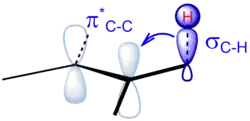In organic chemistry, hyperconjugation (σ-conjugation or no-bond resonance) refers to the delocalization of electrons with the participation of bonds of primarily σ-character. Usually, hyperconjugation involves the interaction of the electrons in a sigma (σ) orbital (e.g. C–H or C–C) with an adjacent unpopulated non-bonding p or antibonding σ* or π* orbitals to give a pair of extended molecular orbitals. However, sometimes, low-lying antibonding σ* orbitals may also interact with filled orbitals of lone pair character (n) in what is termed negative hyperconjugation.[1] Increased electron delocalization associated with hyperconjugation increases the stability of the system.[2][3] In particular, the new orbital with bonding character is stabilized, resulting in an overall stabilization of the molecule.[4] Only electrons in bonds that are in the β position can have this sort of direct stabilizing effect — donating from a sigma bond on an atom to an orbital in another atom directly attached to it. However, extended versions of hyperconjugation (such as double hyperconjugation[5]) can be important as well. The Baker–Nathan effect, sometimes used synonymously for hyperconjugation,[6] is a specific application of it to certain chemical reactions or types of structures.[7]