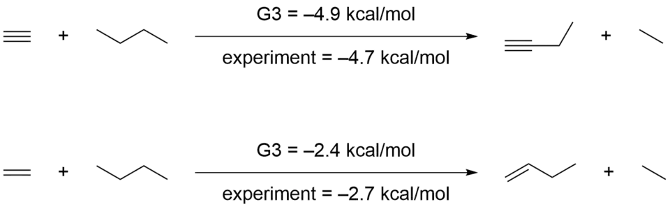 Another group led by Houk[15] suggested the methods employed by Rogers and Kistiakowsky was inappropriate, because that comparisons of heats of hydrogenation evaluate not only conjugation effects but also other structural and electronic differences. They obtained -70.6 kcal/mol and -70.4 kcal/mol for the first and second hydrogenation respectively by ab initio calculation, which confirmed Rogers’ data. However, they interpreted the data differently by taking into account the hyperconjugation stabilization. To quantify hyperconjugation effect, they designed the following isodesmic reactions in 1-butyne and 1-butene.