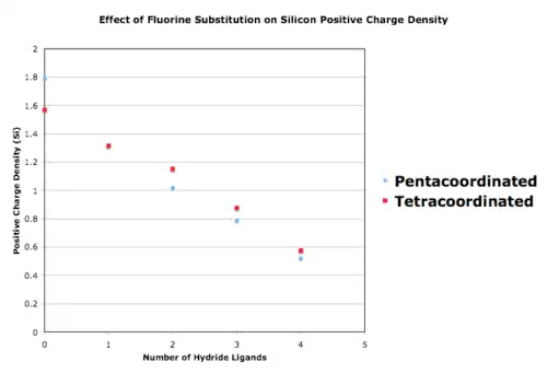 Pentacoordinated compounds should theoretically be less electrophilic than tetracoordinated analogues due to steric hindrance and greater electron density from the ligands, yet experimentally show greater reactivity with nucleophiles than their tetracoordinated analogues. Advanced ab initio calculations were performed on series of tetracoordinated and pentacoordinated species to further understand this reactivity phenomenon. Each series varied by degree of fluorination. Bond lengths and charge densities are shown as functions of how many hydride ligands are on the central atoms. For every new hydride, there is one less fluoride.[36]