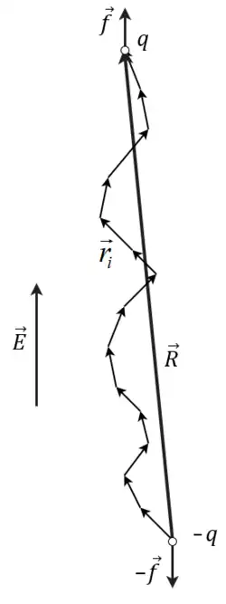 Consider a freely jointed chain of bonds of length subject to a constant elongational force applied to its ends along the axis and an environment temperature . An example could be a chain with two opposite charges and at its ends in a constant electric field applied along the axis as sketched in the figure on the right. If the direct Coulomb interaction between the charges is ignored, then there is a constant force at the two ends.
