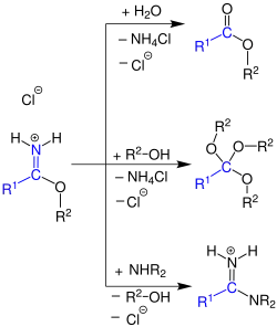 Carboximidates are good electrophiles and undergo a range of addition reactions; with aliphatic imidates generally reacting faster than aromatic imidates.[2] They can be hydrolyzed to give esters and by an analogous process react with amines (including ammonia) to form amidines. Aliphatic imidates react with an excess of alcohol under acid catalysis to form orthoesters RC(OR)3, aromatic imidates can also be converted but far less readily.
