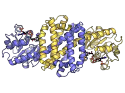 IREDs are dimeric enzymes with each protomer having an N-terminal Rossmann nucleotide-binding domain and a C-terminal dimerization domain joined by a long interdomain α-helix.[3][11] Each protomer's α-helical dimerization domain wraps around the interdomain helix of its dimer partner forming the substrate-binding cleft above the NAD(P)H cofactor binding site in the Rossmann domain. 3-Hydroxybutyrate dehydrogenases have similar N-terminal nucleotide-binding and C-terminal dimerization domains, but do not share the extensive dimerization interface of IREDs.[12]