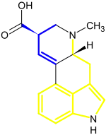 Since ancient times, plants containing indole alkaloids have been used as psychedelic drugs. The Aztecs used and the Mazatec people continue to use psilocybin mushrooms and the psychoactive seeds of morning glory species like Ipomoea tricolor.[72] Amazonian tribes use the psychedelic infusion, ayahuasca, made from Psychotria viridis and Banisteriopsis caapi.[73] Psychotria viridis contains the psychedelic drug DMT, while Banisteriopsis caapi contains harmala alkaloids, which act as monoamine oxidase inhibitors. It is believed that the main function of the harmala alkaloids in ayahuasca is to prevent the metabolization of DMT in the digestive tract and liver, so it can cross the blood–brain barrier, whereas the direct effect of harmala alkaloids on the central nervous system is minimal.[74] The venom of the Colorado River toad, Bufo alvarius, may have used as a psychedelic drug, its active constituents being 5-MeO-DMT and bufotenin.[75] One of the most common recreational psychedelic drugs, LSD, is a semi-synthetic ergoline (which contains the indole moiety).[76]