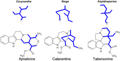 Most monoterpenoid alkaloids include a 9 or 10 carbon fragment (bold in image) (originating from the secologanin), and the configuration allows grouping to Corynanthe, Iboga and Aspidosperma classes. The monoterpenoid part of their carbon skeletons are illustrated below on the example of alkaloids ajmalicine and catharanthine. The circled carbon atoms are missing in the alkaloids which contain the C9 fragment instead of C10.[14]