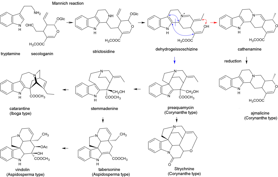 Biosynthesis of monoterpenoid indole alkaloids begins with the Mannich reaction of tryptamine and secologanin; it yields strictosidine which is converted to 4,21-dehydrogeissoschizine. Then, the biosynthesis of most alkaloids containing the unperturbed monoterpenoid part (Corynanthe type) proceeds through cyclization with the formation of cathenamine and subsequent reduction to ajmalicine in the presence of nicotinamide adenine dinucleotide phosphate (NADPH). In the biosynthesis of other alkaloids, 4,21-dehydrogeissoschizine first converts into preakuammicine (an alkaloid of subtype strychnos, type Corynanthe) which gives rise to other alkaloids of subtype strychnos and of the types Iboga and Aspidosperma. Bisindole alkaloids vinblastine and vincristine are produced in the reaction involving catharanthine (alkaloid of type Iboga) and vindolin (type Aspidosperma).[29][44]