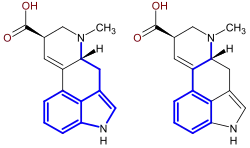 Ergot alkaloids are a class of hemiterpenoid indole alkaloids related to lysergic acid, which, in turn, is formed in a multistage reactions involving tryptophan and DMAPP. Many ergot alkaloids are amides of lysergic acid. The simplest such amide is ergine, and more complex can be distinguished into the following groups:[26][27]