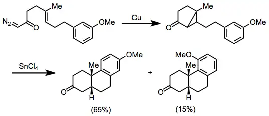 In the presence of a catalytic amount of acid, diazomethyl ketone substrates containing a pendant double bond or aryl group undergo cyclization. The mechanism of this process most likely involves protonation of the diazocarbonyl group to form a diazonium salt, followed by displacement of nitrogen by the unsaturated functionality and deprotonation. In the example below, demethylation affords a quinone.[13]