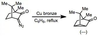 In the presence of an appropriate transition metal (typically copper or rhodium[2]), α-diazocarbonyl compounds are converted to transition metal carbenes, which undergo addition reactions in the presence of carbon–carbon double bonds to form cyclopropanes.[3] Insertion into carbon–carbon or carbon–hydrogen bonds is possible in substrates lacking a double bond.[4] The intramolecular version of this reaction forms fused carbocycles, although yields of reactions mediated by copper are typically moderate. For enantioselective cyclopropanations and insertions, both copper- and rhodium-based catalysts are employed, although the latter have been more heavily studied in recent years.[5]