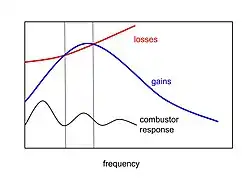 Graphically, for a particular combustor, the extended Rayleigh's criterion is represented in the figure on the right as a function of frequency. The left hand side of the above inequality is called gains, and the right hand side losses. Notice that there is a region where the gains exceeds the losses. In other words, the above inequality is satisfied. Furthermore, note that in this region the response of the combustor to acoustic fluctuations peaks. Thus, the likelihood of a combustion instability in this region is high, making it a region to avoid in the operation of the combustor. This graphical representation of a hypothetical combustor allows to group three methods to prevent combustion instabilities:[1] increase the losses; reduce the gains; or move the combustor's peak response away from the region where gains exceed losses.