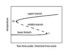 Even though the processes just described are studied with experiments or with Computational Fluid Dynamics, it is instructive to explain them with a simpler analysis. In this analysis, the interaction of the flame with the flow environment is modeled as a perfectly-mixed chemical reactor.[14] With this model, the governing parameter is the ratio between a flow time-scale (or residence time in the reactor) and a chemical-time scale, and the key observable is the reactor's maximum temperature. The relationship between parameter and observable is given by the so-called S-shape curve (see figure). This curve results from the solution of the governing equations of the reactor model. It has three branches: an upper branch in which the flame is burning vigorously, i.e., it is "stable"; a middle branch in which the flame is "unstable" (the probability for solutions of the reactor-model equations to be in this unstable branch is small); and a lower branch in which there is no flame but a cold fuel-oxidizer mixture. The decrease of the fuel-oxidizer ratio or increase of oncoming velocity mentioned above correspond to a decrease of the ratio of the flow and chemical time scales. This in turn corresponds to a movement towards the left in the S-shape curve. In this way, a flame that is burning vigorously is represented by the upper branch, and its blow-off is the movement towards the left along this branch towards the quenching point Q. Once this point is passed, the flame enters the middle branch, becoming thus "unstable", or blows off. This is how this simple model captures qualitatively the more complex behavior explained in the above example of a swirl or bluff-body-stabilized flame.