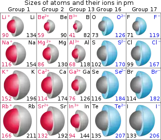 Relative radii of atoms and ions. The neutral atoms are colored gray, cations red, and anions blue.