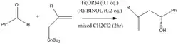 Brueckner and Weigand extended the use of this allylation chemistry to beta-substituted stannanes, including those that contain heterocycles, in 1996, exploring a variety of titanium alkoxides, premixing times, and reaction temperatures.[19] The optimal discovered conditions were 10 mol% Ti(OiPr)4 or Ti(OEt)4, 20 mol% enantiopure BINOL, with a premixing period of 2 hours, giving enantiomeric excesses of up to 99%.