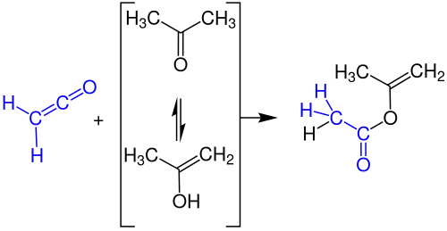 Enol esters are formed from ketenes with enolisable carbonyl compounds. The following example shows the reaction of ethenone with acetone to form a propen-2-yl acetate:
