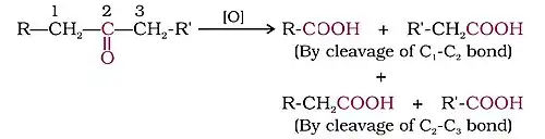 Ketones are cleaved by strong oxidizing agents and at elevated temperatures. Their oxidation involves carbon–carbon bond cleavage to afford a mixture of carboxylic acids having lesser number of carbon atoms than the parent ketone.