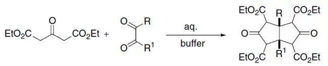 The Weiss–Cook reaction consists in the synthesis of cis-bicyclo[3.3.0]octane-3,7-dione employing an acetonedicarboxylic acid ester and a diacyl (1,2 ketone). The mechanism operates in the same way as the Knoevenagel condensation:[10]