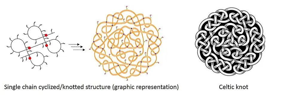 Single Chain Cyclized/Knotted Polymers are a new class of polymer architecture with a general structure consisting of multiple intramolecular cyclization units within a single polymer chain.[1][2][3][4][5][6] Such a structure was synthesized via the controlled polymerization of multivinyl monomers, which was first reported in Dr. Wenxin Wang's research lab. These multiple intramolecular cyclized/knotted units mimic the characteristics of complex knots found in proteins and DNA which provide some elasticity to these structures.[7][8] Of note, 85% of elasticity in natural rubber is due to knot-like structures within its molecular chain.[9][10]