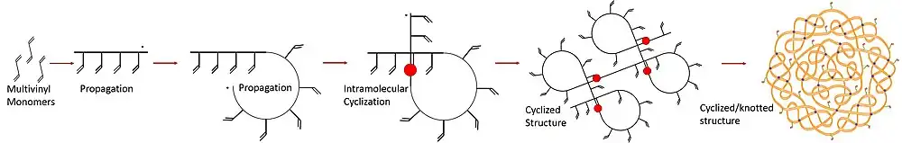 In a similar way to normal ATRP, the polymerization is started by initiation to produce a free radical, followed by chain propagation and reversible activation/deactivation equilibrium. Unlike the polymerization of single vinyl monomers, for the polymerization of multivinyl monomers, the chain propagation occurs between the active centres and one of the vinyl groups from the free monomers. Therefore, multiple unreacted pendent vinyl groups are introduced into the linear primary polymer chains, resulting in a high local/spatial vinyl concentration. As the chain grows, the propagating centre reacts with their own pendent vinyl groups to form intramolecular cyclized rings (i.e. intramolecular cyclization). The unique alternating chain propagation/intramolecular cyclization process eventually leads to the single chain cyclized/knotted polymer architecture.